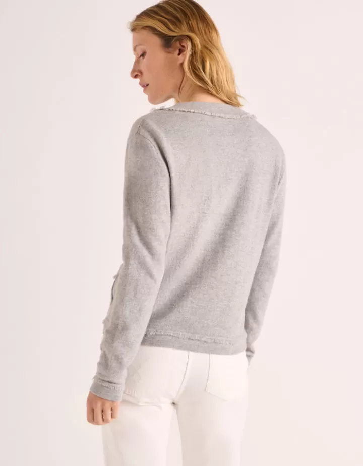 L’encolure ronde adoucit ses lignes, tandis qu’un détail frangé vient souligner sa sagesse apparente, comme un clin d’œil à l’inattendu. Des boutons argentés ponctuent sa fermeture, ajoutant une touche de brillance à sa sobriété.