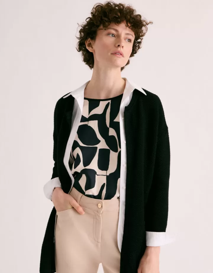 À l’avant, le précieux twill de soie imprimé dévoile un imprimé arty envoûtant, mariant avec subtilité tradition et modernité. Pièce forte à porter seule ou à associer en twin-set avec le gilet GAUGUIN coordonné, on l’adopte pour son allure résolument actuelle, chic et décontractée à la fois.