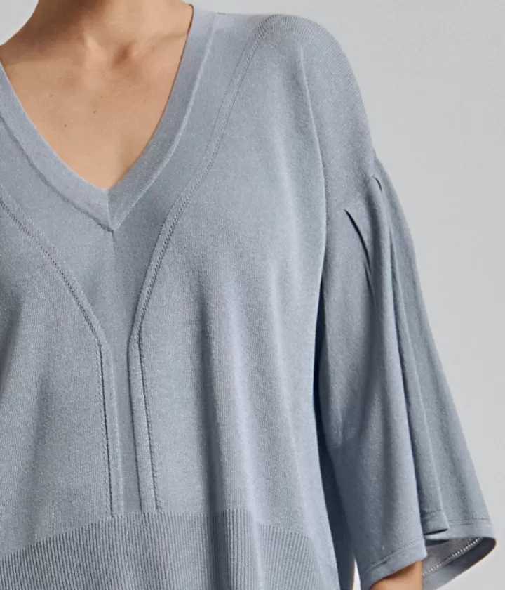 Pull en maille irisée à manches fantaisies.- Pull col V profond- Manches 3/4 pagodes avec de gros plis creux- Détail…