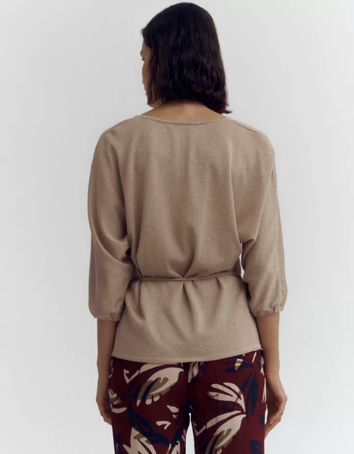 À mi-chemin entre le pull et la blouse, on adore la fluidité de notre maille AMAZONE, en viscose certifiée, et tricotée au sein de nos ateliers historiques, dans la Loire. Une encolure V remaillée, des manches 3/4 resserrées à la coupe chauve-souris, et un lien de serrage au niveau de la taille pour cintrer le pull, tant de détails qui font de cette pièce LA maille a avoir dans son vestiaire pour les beaux jours.
