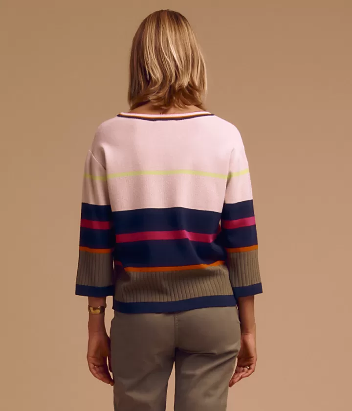 Pull esprit sweat à jeux de rayures placées.- Pièce tricotée au sein de nos ateliers historiques, dans la Loire- Mai…