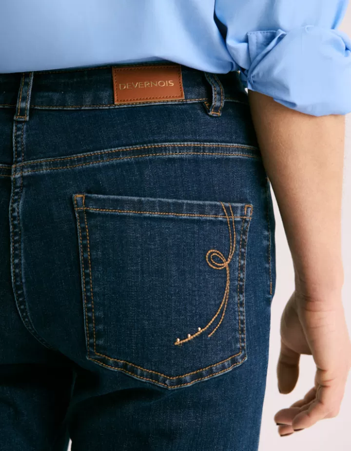 Les détails soignés confèrent un cachet unique : une poche ticket vintage à l’avant, complétée par deux poches classiques. À l’arrière, les poches brodées arborent fièrement des strass qui scintillent subtilement.