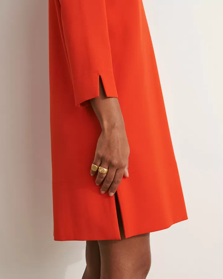 Cette robe à la coupe droite se distingue par son élégance et son confort. Réalisée en double toile stretch, elle offre un ajustement parfait tout en permettant une grande liberté de mouvement.