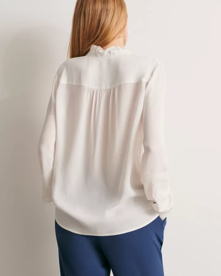 Minimalisme et romantisme s’entrechoquent dans cette pièce au charme subtil. Le crêpe de viscose, fluide et léger, épouse les mouvements avec grâce. L’encolure volantée apporte une touche de féminité sans excès, tandis que l’empiècement dos froncé révèle un détail inattendu.