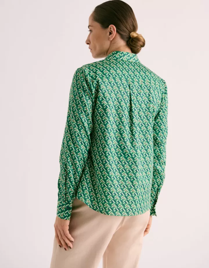 La ville s’habille de lignes audacieuses avec ce chemisier à l’imprimé géométrique. Sur un fond vert qui capte le regard, les motifs dessinent comme une cartographie urbaine, faisant de chaque porté une exploration visuelle.