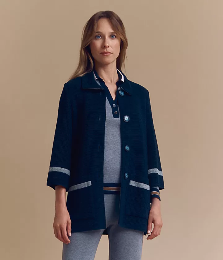 Vestes & Manteaux | Maille>DEVERNOIS Manteau maille mi-long en laine Tricoté en France Bleumarine