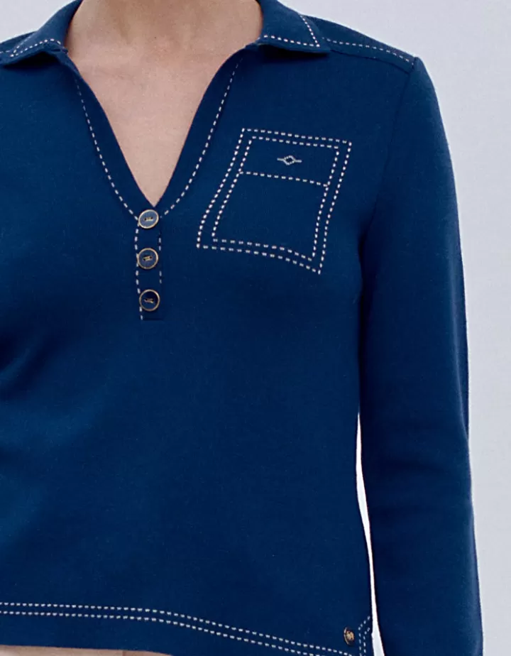 – Dessins placés avec effets de surpiqures sur le tour du polo et la pate de boutonnage
