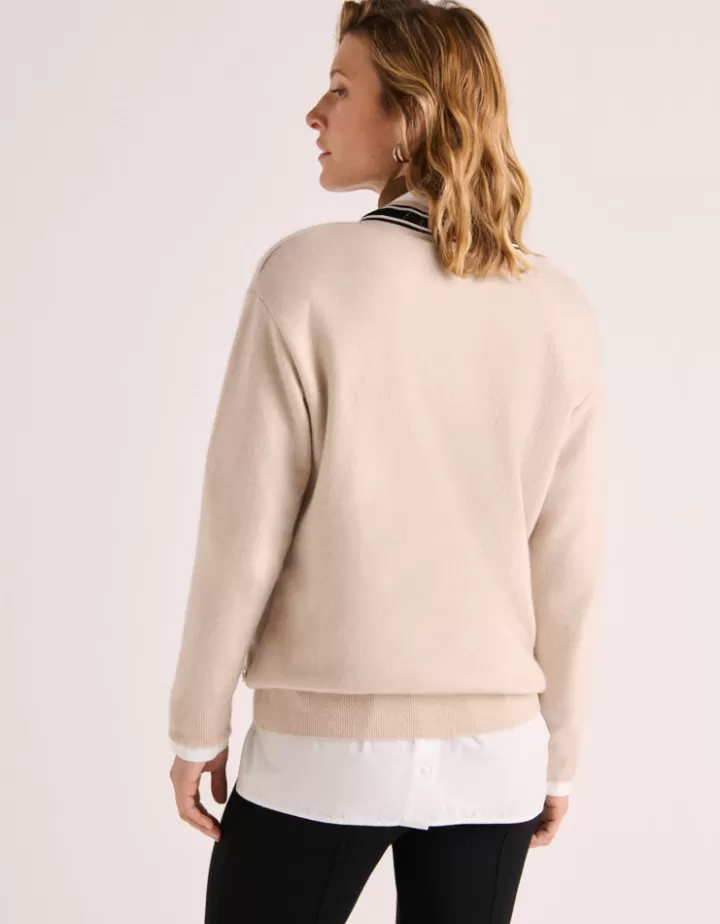 Emprunté au vestiaire masculin, ce pull col V incarne l’élégance intemporelle. Ses manches légèrement tombantes apportent une touche décontractée et effortless à cette pièce moderne tandis que l’encolure se pare d’un large biais à rayures contrastées, clin d’œil malicieux aux uniformes vintage à l’anglaise. Un détail qui fait toute la différence et insuffle un esprit rétro à cette pièce résolument actuelle.